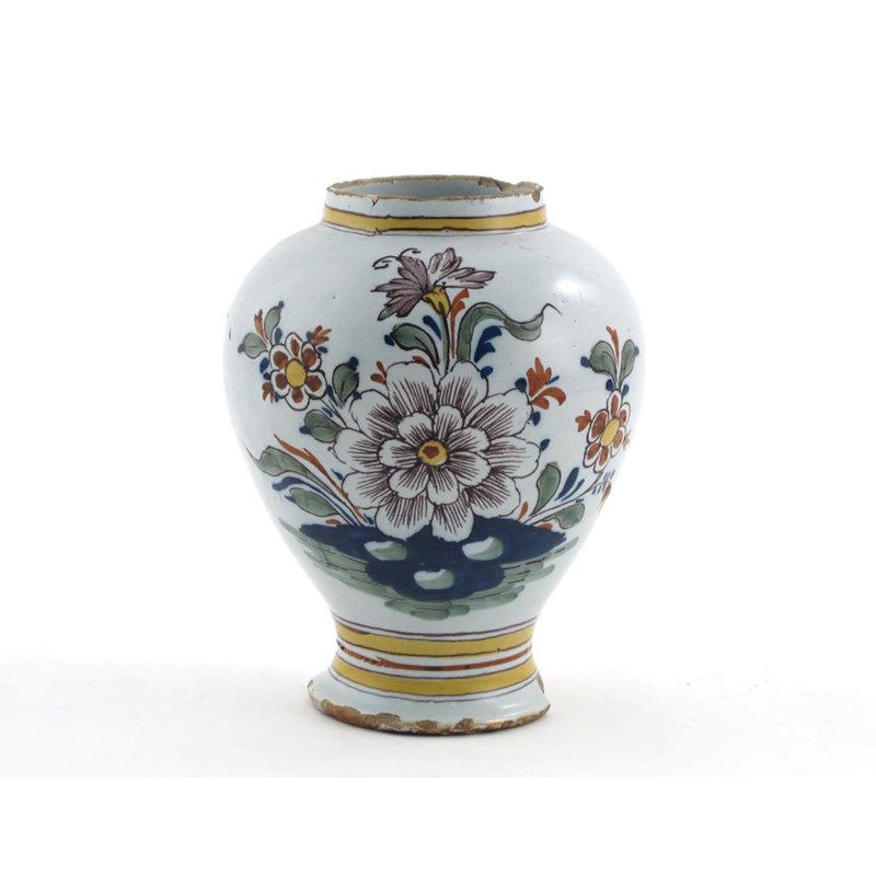 A delftware polychrome vase 18th century, finely painted with an arrangement of flowers between bands of yellow, red and manganese, some chipping, 15cm.