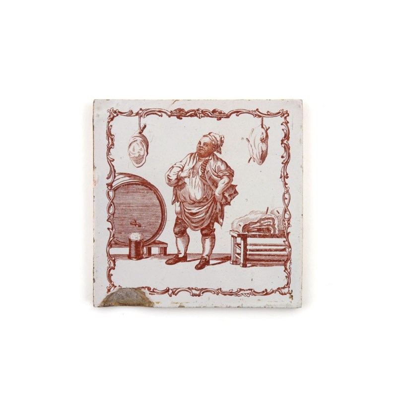 A Liverpool delftware Sadler printed tile c.1765, printed in red with The English Cook, the robust epicure standing amongst large joints of meat and a barrel of ale, within an '88' scroll border, a large chip, 12.5cm.