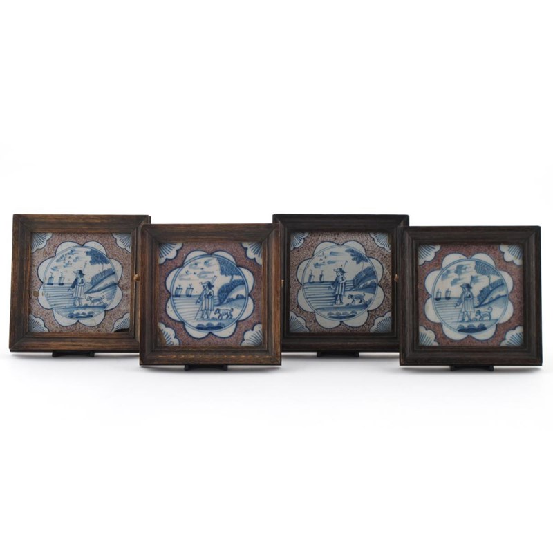 Four delftware tiles 1st half 18th century, probably Liverpool, each painted in blue with a shepherd and his dog before boats in an estuary, reserved on a sponged manganese ground, with blue dandelion corner roundels, framed, the tiles 12.5cm.