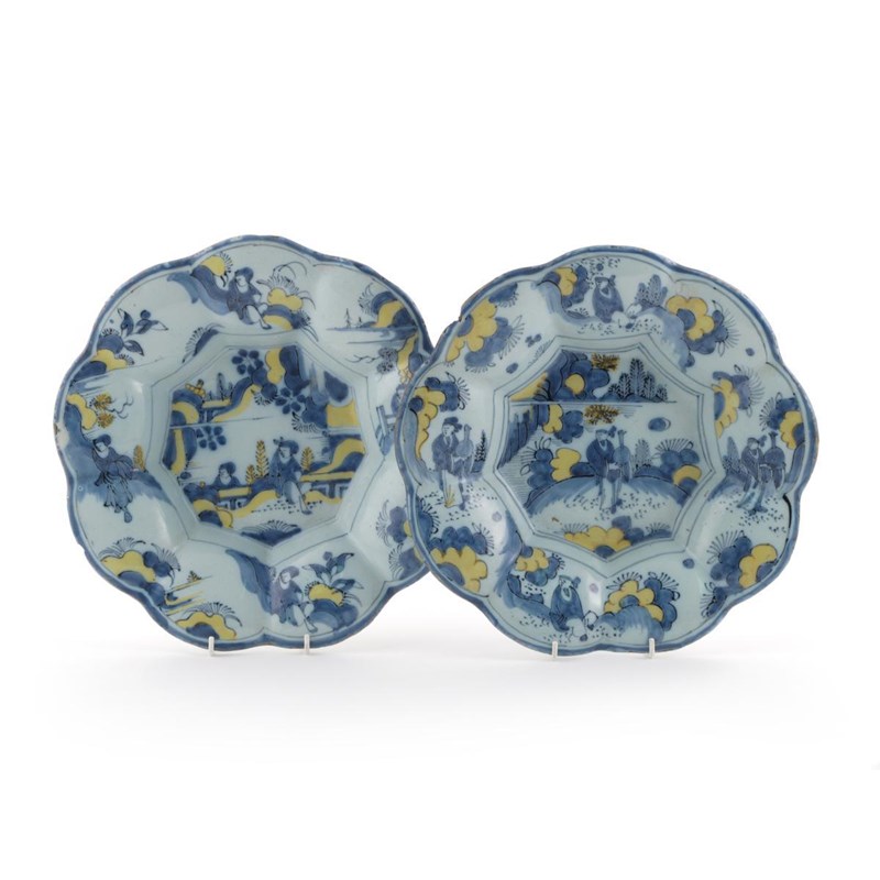 A good pair of Delft lobed dishes 18th century, painted in blue and yellow with Oriental figures seated or standing in garden scenes, 35cm. (2)