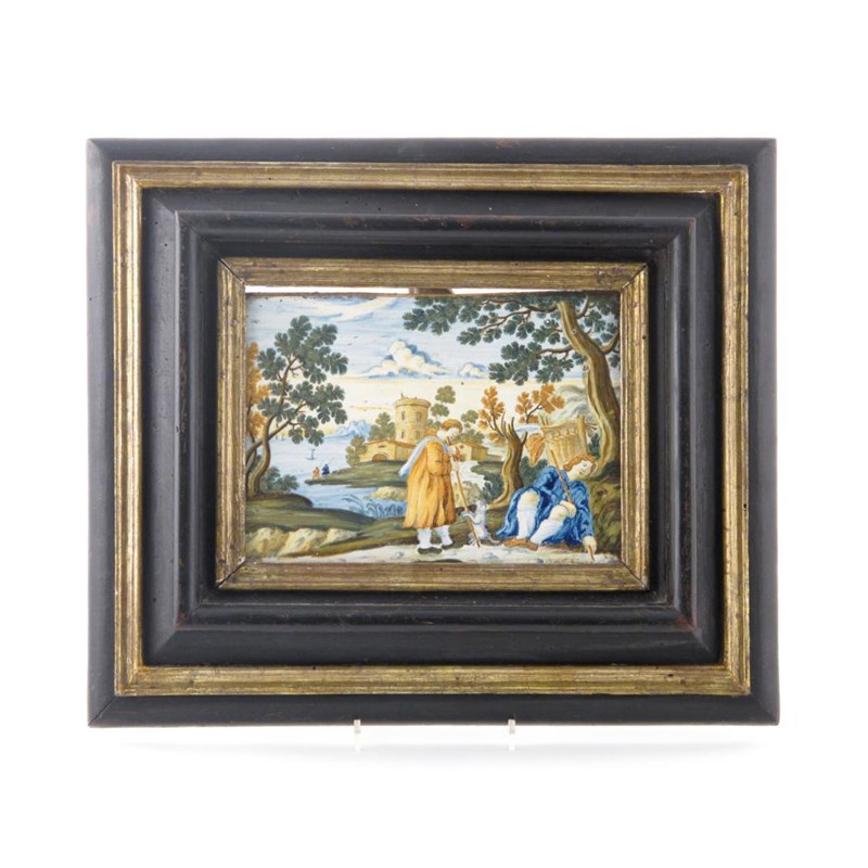 A Castelli maiolica rectangular plaque c.1720-30, painted with two peasants at repose in the foreground beneath a tree and before a lake, framed, 25cm.