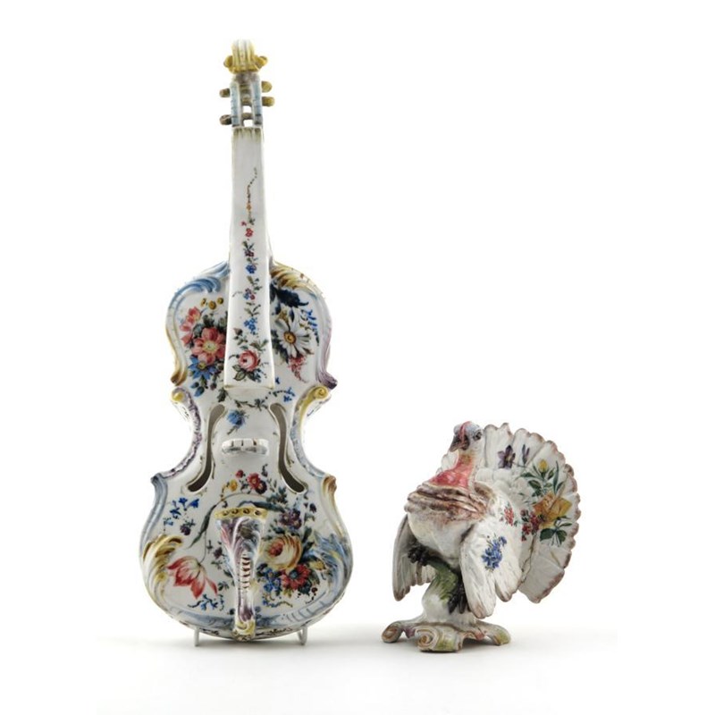 A Nove faïence model of a violin and another of a turkey early 20th century, both painted with flowers and polychrome enamel detailing, damages and restoration, 52cm max. (2)