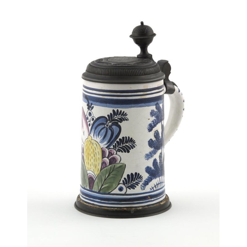 A Continental tin-glazed tankard 19th century, painted in green, yellow, blue and manganese with an arrangement of flowers and leaves, the hinged pewter lid inset with a coin bearing the date 1658 and a crucifix, 24.5cm.