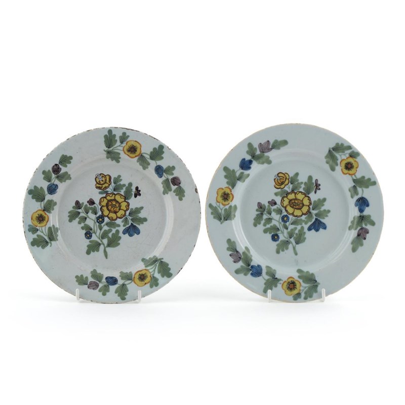 A pair of Bristol delftware polychrome plates 18th century, the wells painted with a large yellow flower with smaller blue and purple blossoms, the rims with three further floral sprigs, the reverse with a B type painter's mark, 12.7cm. (2)