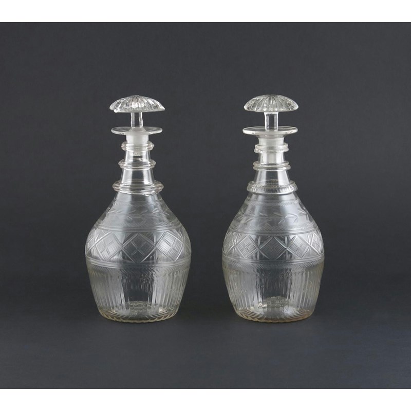 A pair of Irish decanters and stoppers c.1800, of Prussian form, each with three neck rings above bands of cut husk swags and diamond hatching, the bases with moulded flutes, the mushroom stoppers starcut, 25.5cm. (4)