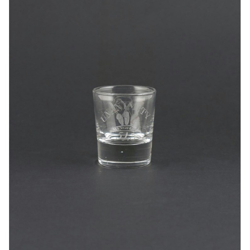 A Masonic firing glass 19th century, the squat cylindrical form engraved with the Three Feathers and titled 'Unanimity', Lodge number '543', 6.5cm.