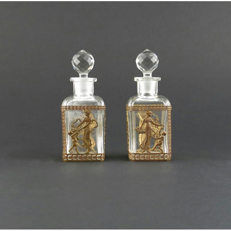 A pair of glass scent bottles and stoppers 19th century, the square section bodies with metal mounts of Classical maidens and putti, the globular stoppers facet cut, 13cm max. (4)