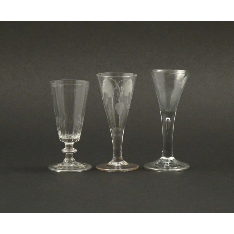 Two ale glasses 2nd half 18th century, one engraved with hops and barley, the other raised on a low knopped stem above a folded foot, and a drawn trumpet wine glass with teardrop stem above a folded foot, 14.5cm max. (3)