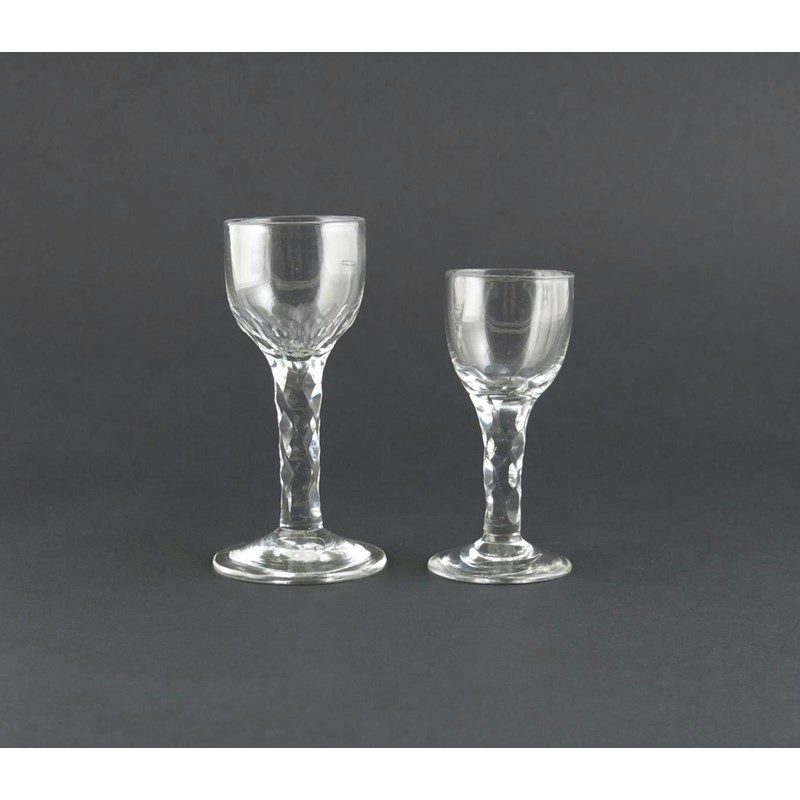 Two wine glasses 2nd half 18th century, the rounded bowls each raised on a facet cut stem, 13.8cm max. (2)