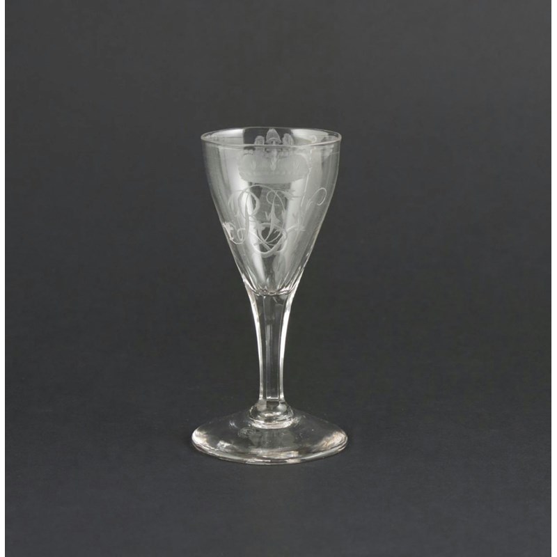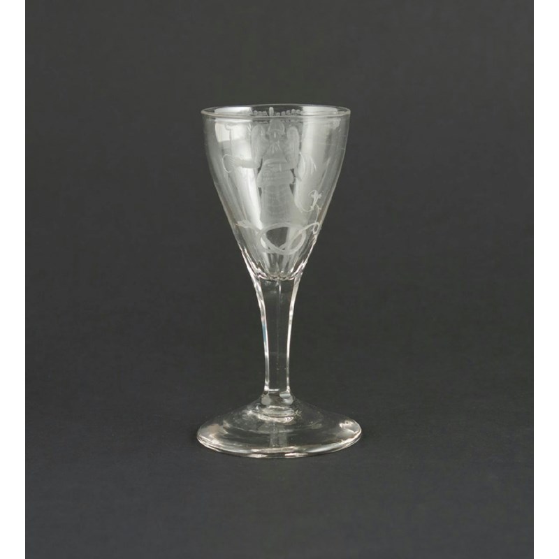 A Royal Dublin Volunteer glass 19th century, engraved with the initials 'RDV' beneath a crown, the reverse with Saint Patrick standing upon a knotted snake, raised on a faceted stem, 11.5cm.