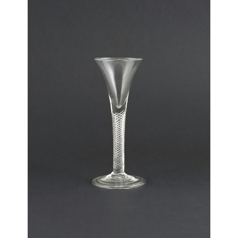 A wine glass mid 18th century, with drawn trumpet bowl raised on an airtwist stem above a folded foot, 18cm.