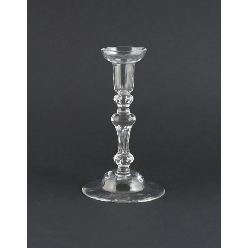 A glass candlestick 19th century, the sconce with a wide drip pan, raised on a Silesian stem above a domed foot, 21.5cm.