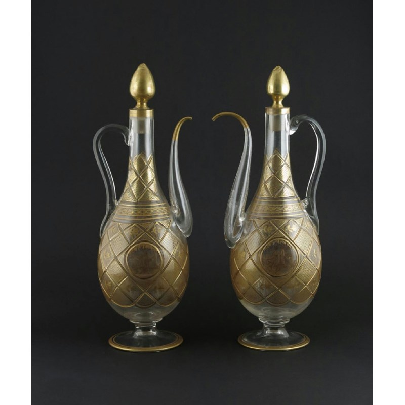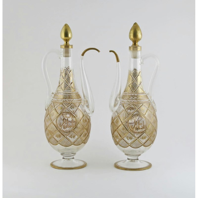 An impressive pair of Beykoz (Ottoman Turkey) clear glass ewers and stoppers 19th century, the pear-shaped bodies cut and gilded around a circular panel with an Arabic inscription, each raised on a low circular foot, the gently curving spouts gilded to the ends, 47cm. (4)