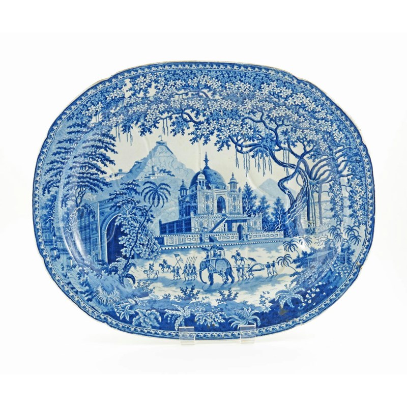 A large Herculaneum blue and white transferware meat dish early 19th century, from the Indian series, printed with a scene of the Mausoleum of Sultan Purveiz near Allahabad, the dish moulded with draining channels, 55.5cm.
