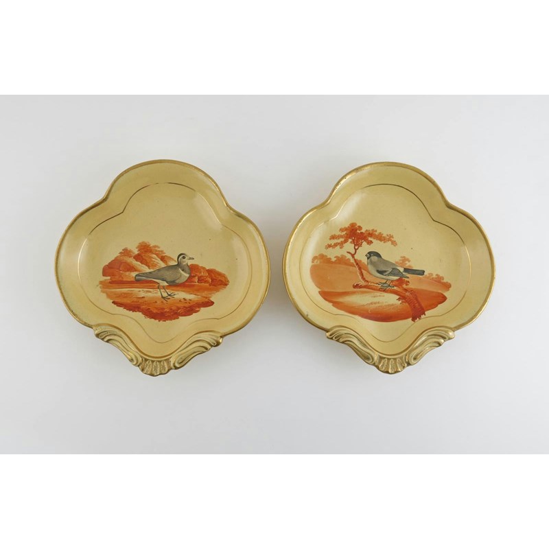 A pair of drabware dessert dishes early 19th century, of shell-shape form, each painted with a bird in grey monochrome against an orange landscape scene, pattern number 235, 20.5cm. (2)