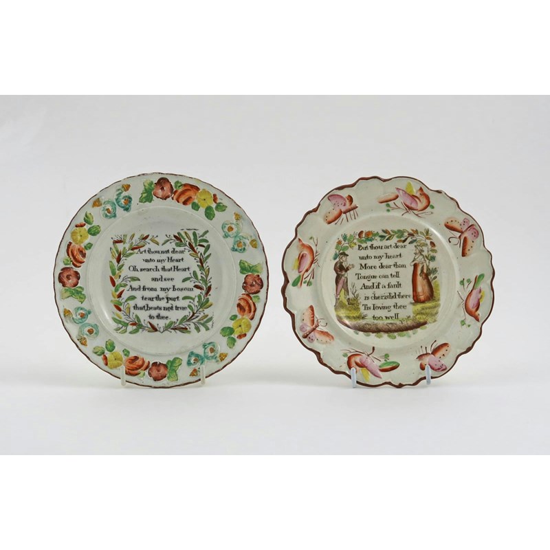 Two pearlware children's or nursery plates 1st half 19th century, each decorated with a short verse within printed and coloured borders, one moulded with flowers, the other with birds and butterflies, 16.5cm. (2)