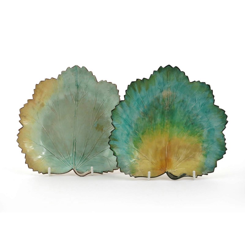 A pair of Davenport creamware leaf dishes early 19th century, each formed as a large vine leaf and coloured in shades of green and yellow, impressed anchor marks, 20cm. (2)