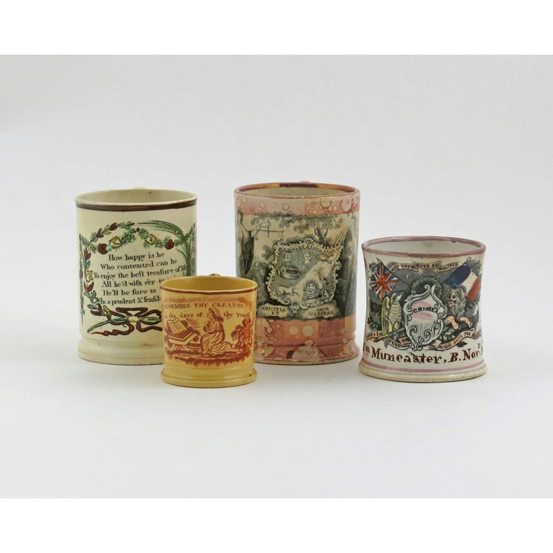Four pottery mugs 1st half 19th century, one of Crimean interest, inscribed 'Wm Muncaster, B. Nov 9th 1854', with pink lustre detailing, a Sunderland lustre Oddfellows mug with a frog to the interior, a creamware frog mug with a six line stanza, and a child's drabware mug titled 'Remember Thy Creator', 12.3cm max. (4)
