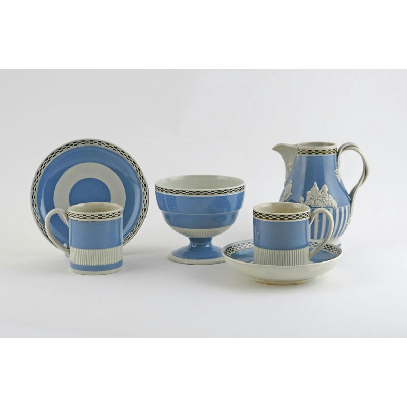 A pearlware part coffee service c.1800, decorated with ribbed bands reserved on a blue ground, the rims with a chequered design, the jug applied with Classical figures and putti. Comprising: a milk jug, a sugar bowl, two coffee cans and two saucers. (6)