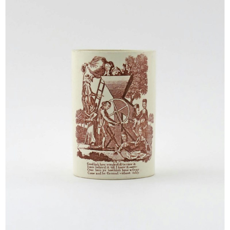 A satirical creamware mug printed with a version of the 'Wonderful Mill' 19th century