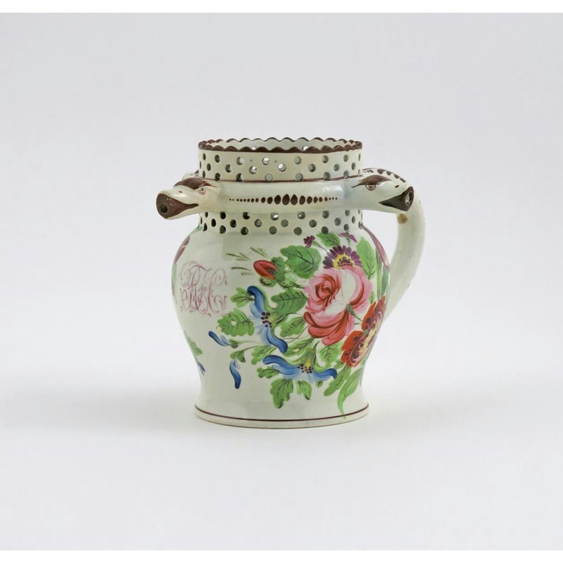 A small pearlware puzzle jug 19th century, boldly painted with flowers around the monogram 'RFC', the neck with three serpent head spouts between bands of piercing, 12.5cm.
