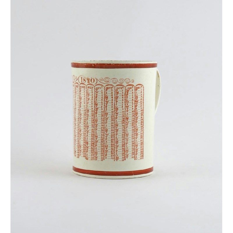 A rare Swansea creamware calendar mug dated 1820, printed in red with the days of each month arranged in vertical columns, Sundays represented by a circle denoting the sun, a simple foliate spray to the handle, 11.5cm.