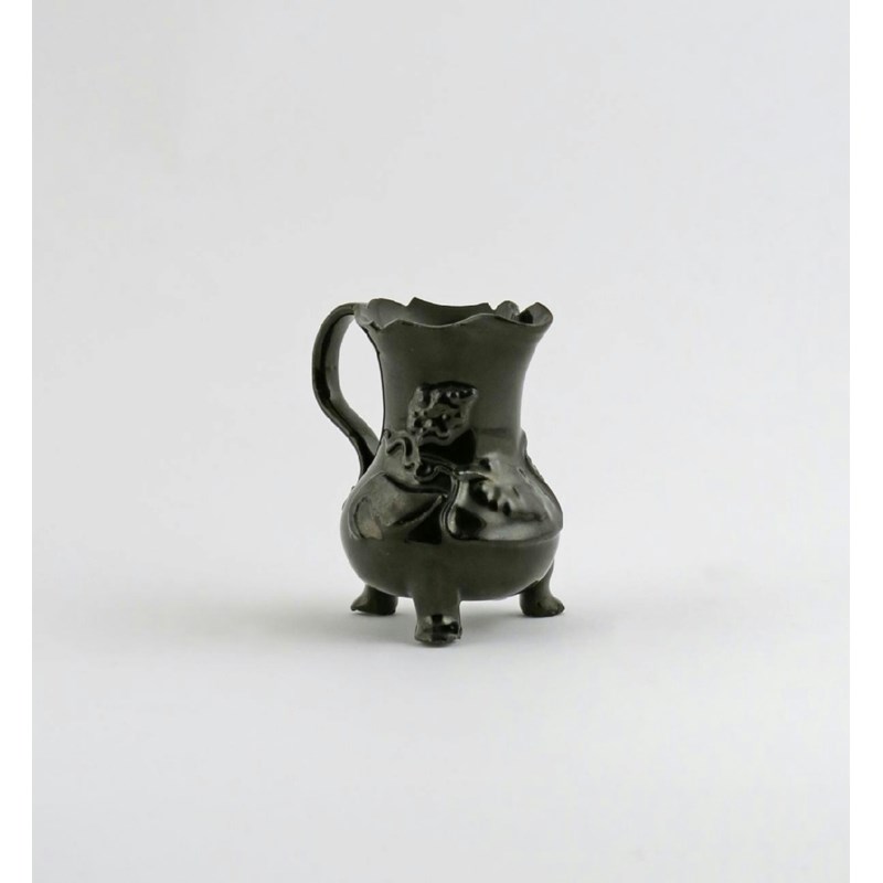 A Jackfield cream jug c.1760, moulded with fruiting vine and raised on three paw feet, decorated in a rich black glaze, 8cm.