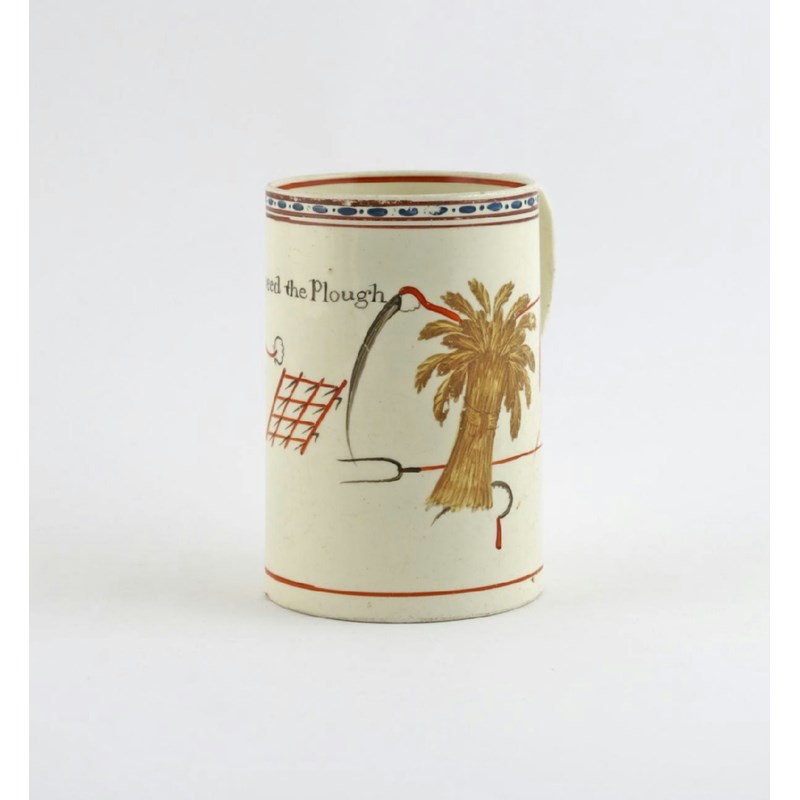 A creamware farming mug early 19th century, painted with various farming implements including a sickle, rake, pitchfork and corn stook, titled 'God speed the Plough', 12cm.