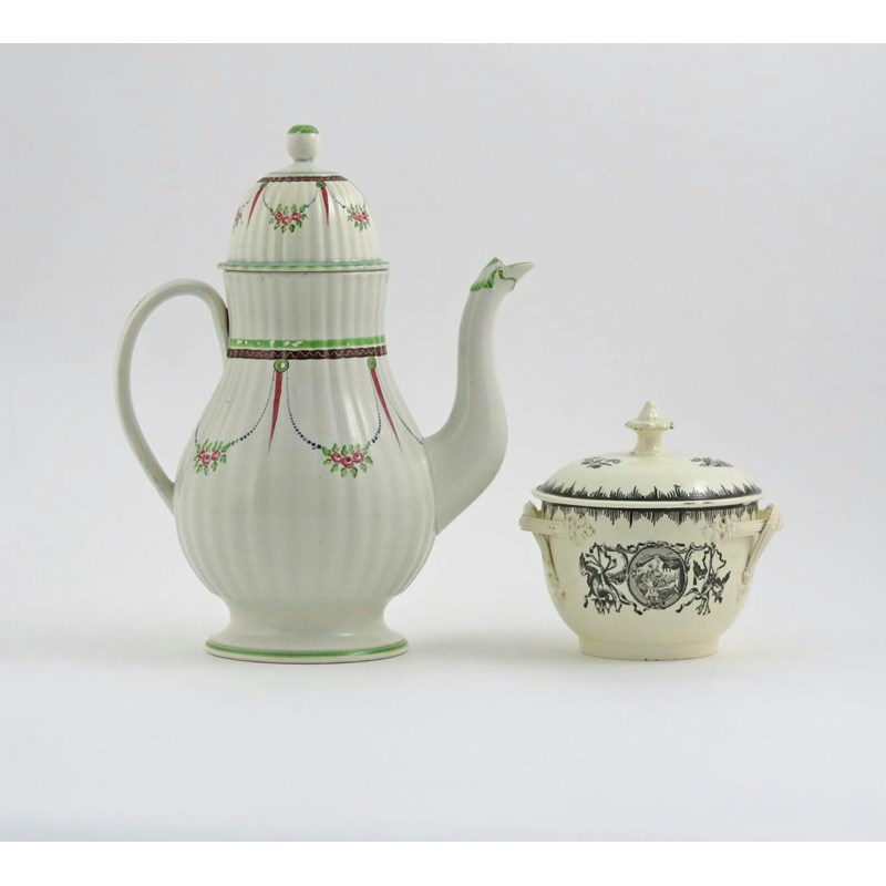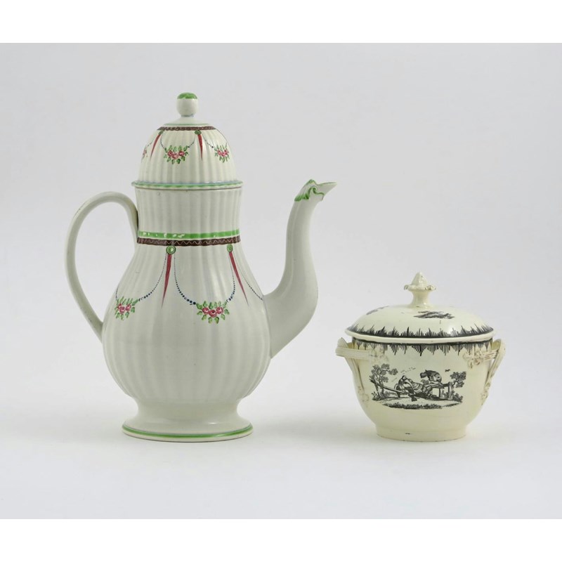 A Neale creamware sucrier and cover c.1785, printed in black with a panel of Minerva surrounded by emblems of Wisdom and Industry, titled 'Let Wisdom Unite Us', the reverse with birds, and a fluted pearlware coffee pot and cover painted with rose garlands, 27cm max. (4)