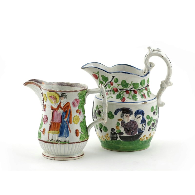Two pearlware moulded jugs 1st half 19th century, one moulded and coloured with a promenading couple, the other with drinkers between garlands of hops and grapevine, 21cm max. (2)
