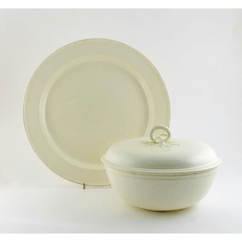 A massive Leeds Pottery creamware circular charger 19th century, impressed mark, and a large creamware circular tureen and cover, the cover with an elaborate finial issuing from applied leaves, 45cm. (3)