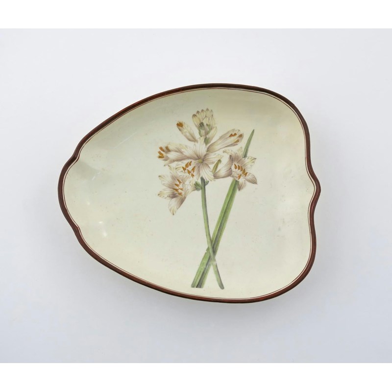 A creamware shaped botanical dish 1st half 19th century, well painted with a floral specimen of spiderwort, titled in red with 'St Bruno's Lily, 6' to the reverse, brown line rim, 22cm.