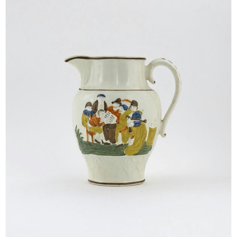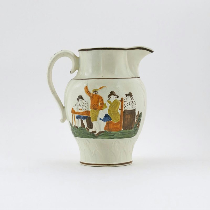 A Herculaneum pearlware jug early 19th century, moulded with scenes of carousing drinkers and decorated in Pratt colours, impressed mark, 19cm.