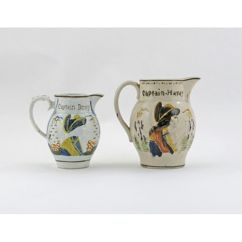 Two pearlware moulded Admiral Nelson jugs 19th century, moulded with the famed naval officer to one side, the reverse of the larger with Captain Hardy, the smaller with Captain Berry, each in Pratt type colours, 16cm max. (2)