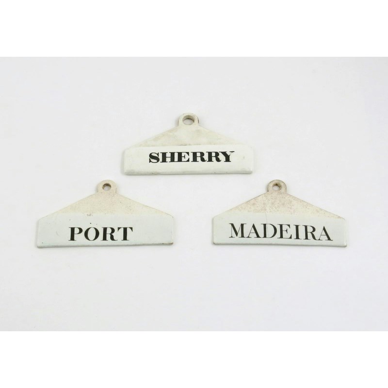 Three English creamware bin labels 19th century, two Wedgwood and titled 'Madeira' and 'Port', the third Minton titled 'Sherry', all of coathanger form, impressed marks, 14cm. (3)