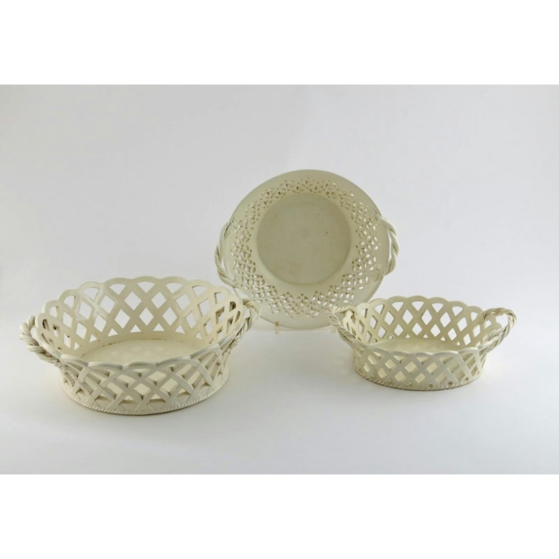 Three creamware baskets late 18th century, two with open strapwork sides and twisted handles, the last with sharply sloping sides elaborately pierced with a stylized floral design, 26.5cm max. (3)