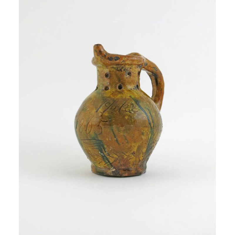 A Donyatt puzzle jug dated 1865, with sgraffito decoration of a man smoking a pipe and a bird perched on a branch, incised 'John Hake 1865', the whole decorated in a mottled green and yellow glaze, 17cm.