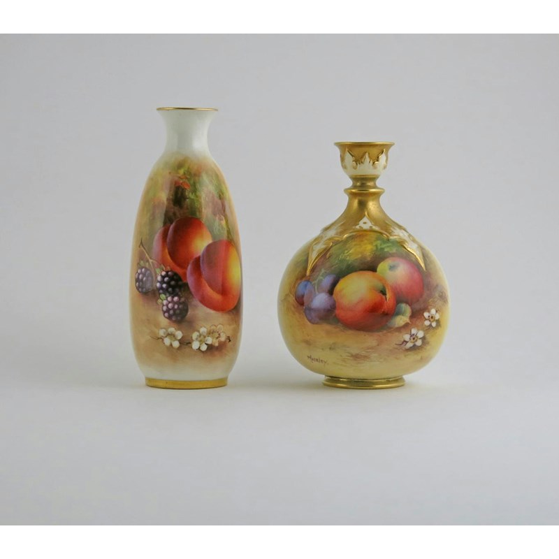 Two Royal Worcester small vases date codes for 1930 and 1932, the first painted by George Moseley with apples, grapes and blossom, the shoulders with raised moulded panels, the second painted by Harry Ayrton in a similar manner with peaches and blackberries, both signed, printed marks, 14.5cm max. (2)
