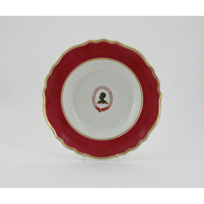 A Chamberlain's Worcester armorial or anti-slavery soup plate 19th century, the well painted with the head of a blackamoor within the Welsh motto Asgre Lan Diogel Ei Pherchen (A clear conscience is the best shield), within a claret border, impressed 2 mark, 26.5cm.