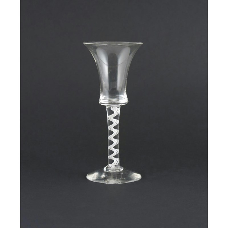 A large wine glass c.1760, with waisted bucket-shaped bowl rising from an opaque cable twist stem, 18.5cm.