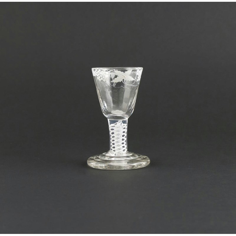 A rare Beilby firing glass c.1765, the bucket-shaped bowl enamelled in white with a continuous band of grapevine around the rim, raised on a squat double series opaque twist stem above a thick stepped foot, 9.2cm.
