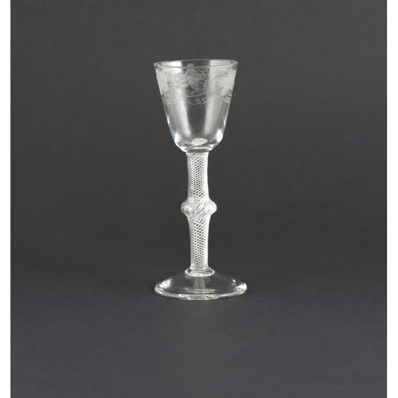 A wine glass c.1760, the funnel bowl engraved with a continuous band of grapevine, raised on an airtwist stem with a single central knop, 15cm.
