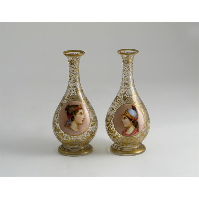 A pair of Bohemian glass bottle vases 19th century, each enamelled with a panel of a profile portrait, the reverses with panels of flowers, on an ornate gilt foliate ground, 17.5cm. (2)