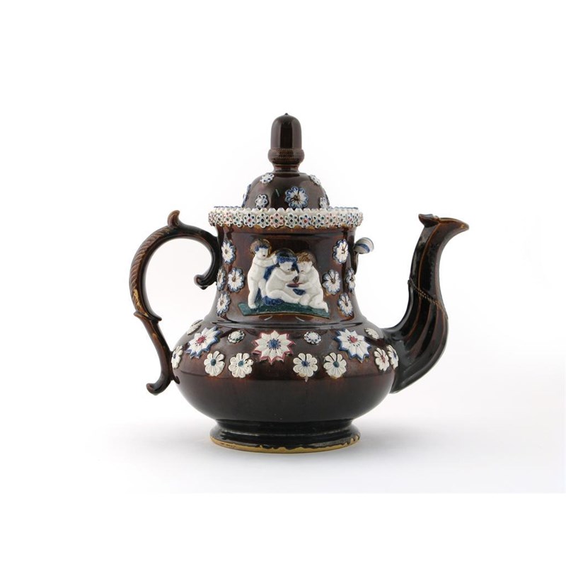 A large bargeware teapot 19th century, the pear-shaped body applied with floral roundels and vignettes of three putti, 45cm. (2)