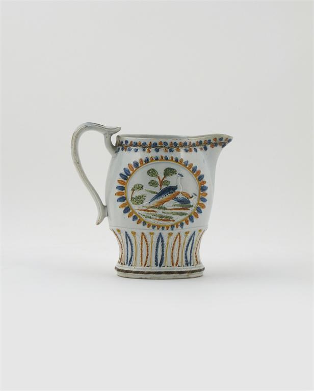 A Pratt ware jug c.1790, each side moulded with a panel containing peacocks above a stiff leaf border, enamelled in a typical palette of blue, green and ochre, some restoration to the spout and rim, 17cm.