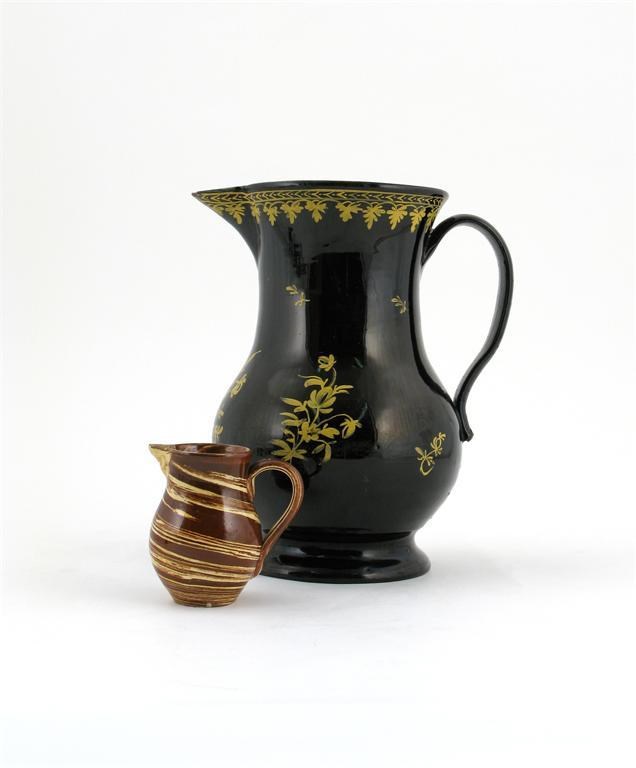 A Jackfield type jug 19th century, painted with sprays of stylized yellow flowers on a brownish-black ground, and a smaller agateware jug striated with cream and treacle glazes, a chip to the larger jug's spout, 23.5cm max. (2)