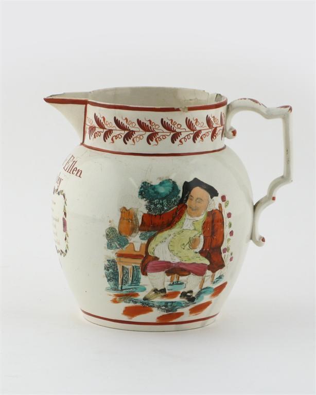 A named and dated pearlware jug, one side printed and overpainted with The Farmer's Arms, the other with a large toper, inscribed 'Matthew & Ellen Bayley 1810' with a six line stanza, some damages to the rim, 20cm.