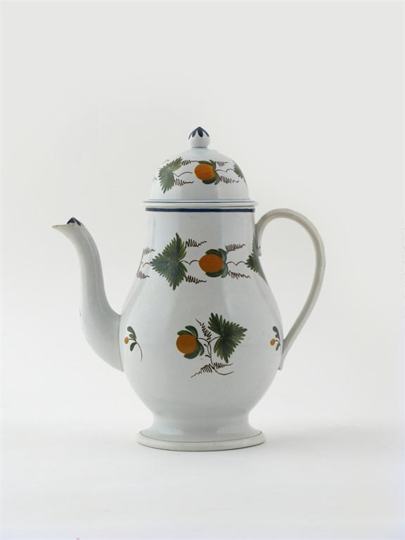 A Pratt ware coffee pot and cover early 19th century, typically decorated in green, brown, ochre and blue with a stylized floral design, minor restoration to the cover, 29cm. (2)