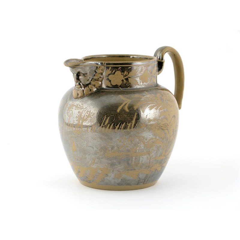 A large silver lustre jug 1st half 19th century, decorated with ships, trees and birds, inscribed 'Joseph Hackwood' over a café au lait ground, the spout moulded as a mask head, some wear, 27cm.