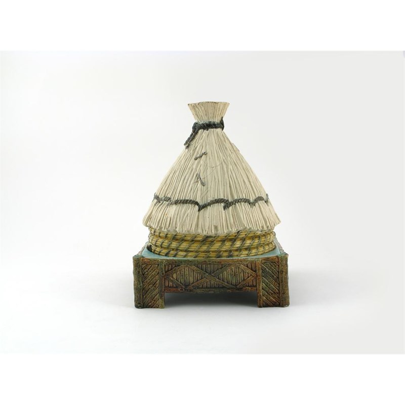 A George Jones Majolica Stilton cheese stand and cover c.1872, modelled as a thatched straw hive raised on a square stand, registration diamond, damages and repairs, 34cm. (2)